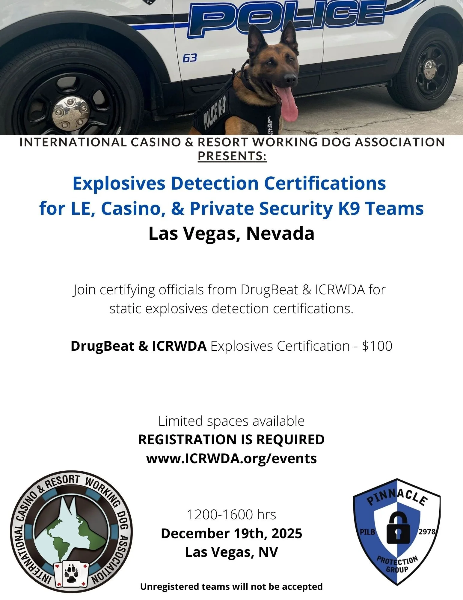 Back to All Events Static Explosives Detection K9 Certifications for LE, Casino, & Private Security Teams Friday, December 19, 2025 12:00 PM 5:00 PM Las Vegas, NV (map) Google Calendar ICS