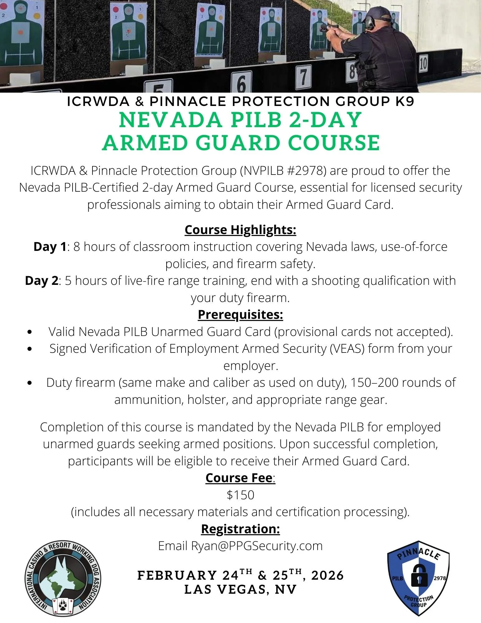 Back to All Events Nevada PILB 2-Day Armed Security Officer Course Tuesday, February 24, 2026 9:00 AM Wednesday, February 25, 2026 5:00 PM Las Vegas, NV (map) Google Calendar ICS